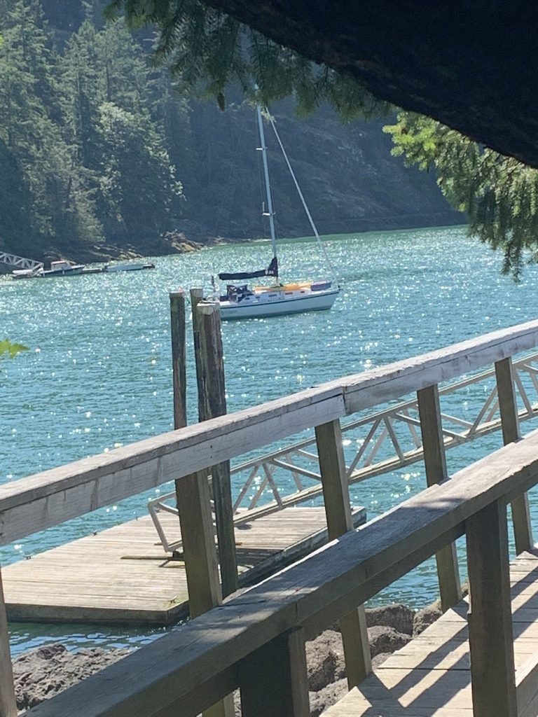 - Protected anchorage in 5-8 metres off the bay’s southern shore. There is a pontoon in the middle of the bay, and south of the pontoon are private mooring buoys.